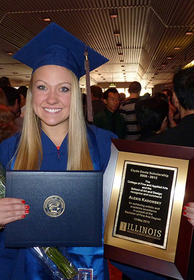 Alexis Kadonsky is a fine artist, 3D animator, and designer from Chicagoland, born in 1990. On a fully funded art scholarship, Alexis received a BFA in graphic design from the University of Illinois Urbana-Champaign. She continued on to achieve her MFA in 3D Computer Animation from the School of Visual Arts in New York City and was named Sony Pictures Imageworks IPAX Scoredos Scholar for exemplary achievements and truly special talent and passion for film, effects, and animation. Alexis embraces her attention to detail throughout many mediums as demonstrated in her diverse portfolio. Art acts as an escape for Alexis, and she strives to tell a unique story with her work while enjoying getting lost in the process of creating. She also has a passion for travel and has spent over two years of her life traveling around Europe and Australia to further expand her views on art and the world. Although her work is inspired from many paths, Alexis believes her best creativity ignites from her personal experiences.